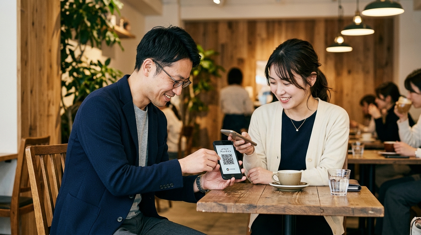 相手に「スマホを操作させる手間」と「プライバシーを晒す不安」を軽減させるために、まずは自分のQRコードを表示して見せるのがスマートです。